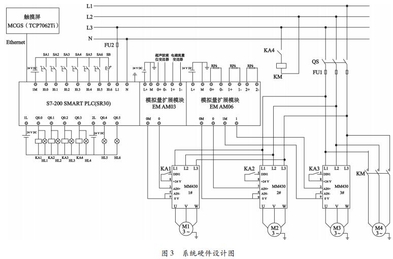 ( 1) 控制器采用 SIEMENS S7-200 SMART PLC ( SR30) ,配有 2 個模擬量擴(kuò)展模塊 EM AM03 和 EM AM06,實(shí)現(xiàn)模擬量地采集以及模擬量輸出[6];