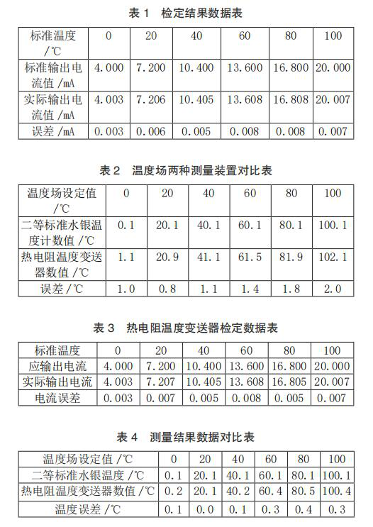 對溫度變送器和熱電阻分別進行檢定,之后進行安全裝合后投入到溫度場內(nèi),之后把獲取到的測量值與二等標準水銀溫度計數(shù)值進行比較。然后,對熱電阻溫度變送器實現(xiàn)全面的校驗。把溫度測量儀表存入標準溫度場內(nèi),利用熱電阻元件來對溫度場具體溫度進行測量,變送器裝置會把電阻數(shù)值轉變?yōu)闃藴实碾娏餍盘?,對輸出電流信號進行測量,換其轉換成相應的溫度值,并與二等標準水銀溫度計顯示的數(shù)值進行比較,從而檢定熱電阻以及溫度變送器,A 級的鉑熱電阻可測量 20-100 度區(qū)間,誤差為 ±(0.15+0.002)。當溫度為 0 時的電阻值為 100.1 度,100 度時電阻值為 138.71度,α 為 0.00386,熱電阻檢定結果可以達到技術指標需求。0.5 級溫度變送器,可以測量 0 ~ 100 度的溫度區(qū)間,誤差為 ±0.5%,溫度變送器檢定結果(表 1)可以達到性能指標需求。把兩者組裝之后存放到標準溫度場內(nèi),把測量溫度與二等標準水銀溫度計進行比較(表 2),溫度變送器檢定數(shù)據(jù)見表 3,熱電阻溫度變送器檢定之后在標準溫度場與二等準水銀溫度進行比較分析數(shù)據(jù)見表 4 所示。