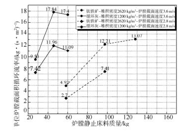 究,圖 10 給出了不同物性床料顆粒的爐膛靜止床料質(zhì)量與循環(huán)流率關(guān)系圖。由圖可知,爐膛靜止床料質(zhì)量約60kg,爐膛截面風(fēng)速為2. 8 m/s 時(shí),循環(huán)灰顆粒循環(huán)流率為 11. 09 kg/( s × m 2 ) 明顯高于鈦鐵礦顆粒的循環(huán)流率 2. 70 kg/( s × m 2 ) ; 爐膛截面風(fēng)速為 3. 6 m/s 時(shí),循環(huán)灰顆粒循環(huán)流率為17. 40 kg/( s × m 2 ) 明顯高于鈦鐵礦顆粒的循環(huán)流率4. 92 kg/( s × m 2 ) ,即循環(huán)灰的循環(huán)流率明顯