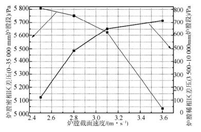 在試驗(yàn)截面速度范圍內(nèi) ( 2. 5 m/s → 3. 6 m/s) ,爐膛密相區(qū) ( h = 0 ~ 3 500 mm) 和稀相區(qū) ( h =3 500 mm ~10 000 mm) 壓降與截面速度的關(guān)系曲線見圖 6,由曲線可知隨著截面速度增加爐膛密相區(qū)的壓差呈現(xiàn)下降趨勢 ( 5 800Pa → 5 035 Pa) ,爐膛稀相區(qū)差壓值呈現(xiàn)上升趨勢 ( 122Pa → 715 Pa) ,表明,隨著截面速度升高,爐膛密相區(qū)床料充氣膨脹更強(qiáng)烈,氣/固比升高,而稀相區(qū)壓差隨截面速度的升高而升高,說明氣體對鈦鐵礦顆粒的攜帶能力增強(qiáng)。