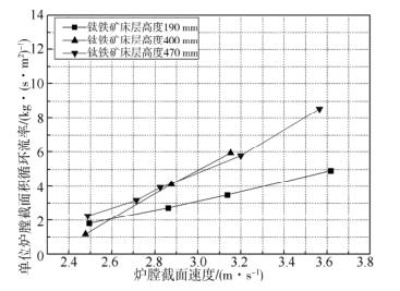 ( 3) 本次試驗(yàn)鈦鐵礦和循環(huán)灰兩種顆粒均隨著爐膛截面流速的升高,單位爐膛截面的循環(huán)流率增大; 在相同物料量和流化速度下,循環(huán)灰的循環(huán)流率明顯高于鈦鐵礦的循環(huán)流率。