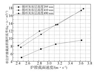 圖 7 給出采用鈦鐵礦為試驗(yàn)床料,靜止?fàn)t膛高度分別為190 mm、400 mm、470 mm ( 即對應(yīng)床料量分別 58. 2 kg、128. 3 kg、153. 2 kg) ,不同截面速度與循環(huán)速率的趨勢圖。由圖可知,對不同床料量鈦鐵礦而言,隨著爐膛截面流速的升高,單位爐膛截面的循環(huán)流率增大。圖 8 給出采用 600MW 超臨界 CFB 鍋爐燃煤機(jī)組的循環(huán)灰為試驗(yàn)床料,靜止?fàn)t膛高度分別為 295 mm、410 mm、490mm ( 即對應(yīng)床料量分別 27. 3 kg、45. 7 kg、60. 0kg) ,不同截面速度與循環(huán)速率的趨勢圖。由圖可知,不同靜止?fàn)t膛高度的循環(huán)灰循環(huán)流率與爐膛截面速度均呈現(xiàn)線性關(guān)系。