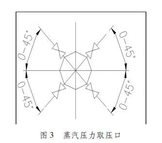 4) 當(dāng)蒸汽壓力時(shí),取壓口應(yīng)選在管道橫截面上、下部,并且與管道水平中心線成 45°的范圍內(nèi),如圖 3 所示。