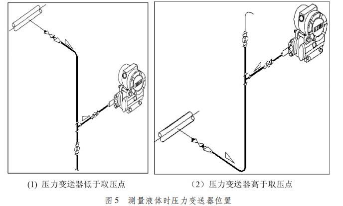2) 當(dāng)測(cè)量液體壓力時(shí),應(yīng)優(yōu)先選擇變送器低于取壓點(diǎn)的安裝方案,這樣可以保證導(dǎo)壓管內(nèi)不易集氣體,否則需要在導(dǎo)壓管的非常高處增加排氣閥,或者設(shè)置集氣器,如圖 5 所示。