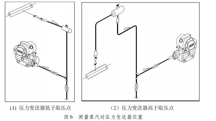 3) 當(dāng)測(cè)蒸汽時(shí),應(yīng)優(yōu)先選擇變送器低于取壓點(diǎn)的安裝方 案,這樣可以保證導(dǎo)壓管內(nèi)不易集氣體,另外還需要在導(dǎo)壓管非常高處增加冷凝管,以避免蒸汽高溫對(duì)