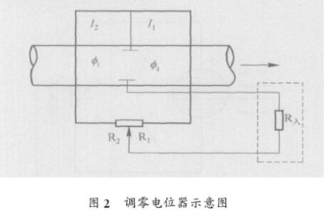 在電磁流量計變送器的結(jié)構(gòu)中,應(yīng)使閉環(huán)的平面與交變磁力線保持平行,以避免磁力線通過閉環(huán),并應(yīng)設(shè)置千擾調(diào)節(jié)機構(gòu)以減少千擾。干擾信號ET。另外,在變壓器干式饋線上設(shè)置零電位器。如圖2所示。兩根導(dǎo)線從一個電極引出,分別繞過磁極形成兩個回路。當磁力線被共同保護以通過閉合回路時,有必要在兩個回路中沿相反的方向產(chǎn)生感應(yīng)電勢。因此,在兩個回路中存在相反方向的電流I1和I2。通過調(diào)節(jié)零電位器,R輸入上兩個電路中的電流I1和I2產(chǎn)生的電位相互抵消,以減少90°干擾信號。