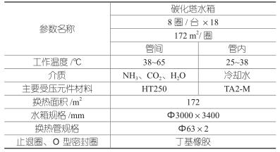 設(shè)備,冷卻水箱配置為8 個,采用了業(yè)界比較先進(jìn)的鈦冷卻管,通過循環(huán)冷卻水將塔內(nèi)的氨鹽水的溫度降低,傳熱效率大為提高,單