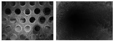 通過對單法蘭液位計工藝工況及結(jié)垢原理的分析,基本判定水箱鈦管內(nèi)壁的混合水垢主要成份為碳酸鹽,其它還有硅酸鹽、硫酸鹽等,這些復(fù)合型水垢附著在鈦管表面上,呈現(xiàn)為結(jié)晶致密、質(zhì)地堅硬、附著牢固,點(diǎn)狀表觀,見圖 2 水箱拆卸及鈦管高壓水清洗一定粗糙度的均勻水垢。