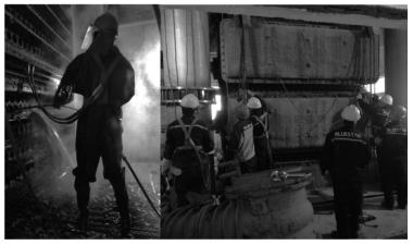 堿廠設(shè)備在以往的檢修清洗經(jīng)歷中,檢修單位都基本都采用 20% 的 HCl 溶液對鈦管進(jìn)行化學(xué)清洗,施工安全風(fēng)險大,設(shè)備腐蝕嚴(yán)重,除垢清洗效果不理想。本次單法蘭液位計鈦管除垢清洗,采用高壓水清洗工藝對單法蘭液位計內(nèi)鈦管進(jìn)行清洗。按照業(yè)主方要求對 15 號塔先用高壓水工藝進(jìn)行施工,施工工序?yàn)?:碳化單塔系統(tǒng)停車—置換、隔離—搭建清洗施工操作平臺—割斷、剝離水箱蓋螺栓—拆卸水箱蓋—鈦管高壓水清洗—驗(yàn)收及復(fù)位。圖 2 所示水箱拆卸及高壓水清洗操作。