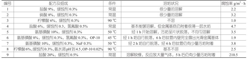 通過技術(shù)人員大量的現(xiàn)場實(shí)踐數(shù)據(jù)總結(jié)與類似設(shè)備成功清洗案例的對照,我們認(rèn)為該類型水垢完全可通過化學(xué)清洗方法有效清除,使鈦管內(nèi)壁水垢完全剝離呈現(xiàn)金屬光面,從而達(dá)到高效換熱的目的。技術(shù)人員進(jìn)行了一系列的溶垢及清洗小型試驗(yàn),以確定非常佳清洗方案。