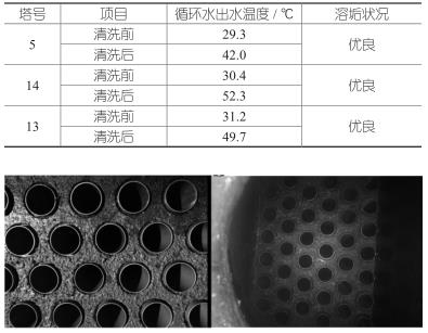 ?。?)控制鈦管內(nèi)清洗流體流速應(yīng)在 0.3~0.8 m/s 之間 ;(2)加藥溫度應(yīng)在 35~38 ℃ ;清洗過程控制溫度在45~52 ℃之間,清洗液溫度嚴(yán)禁超過 55 ℃ ;(3)清洗時間控制在 12 h 之內(nèi),但應(yīng)盡量縮短清洗時間,可通過觀察鈦管表面清洗程度來判斷非常佳結(jié)束節(jié)點(diǎn) ;(4)不參與清洗的設(shè)備部件,如調(diào)節(jié)閥、過濾器、壓力表、溫度計等測試、測量儀表均應(yīng)拆除或抽芯。不參與清洗系統(tǒng)要確認(rèn)能夠有效隔離 ;(5)酸洗結(jié)束后應(yīng)由下而上先進(jìn)行水頂酸的沖洗,以防止鈦管上部粘粘懸浮物體而影響清洗效果,待沖洗出水較澄清時可反向沖洗 ;(6)為有效減少氣阻,應(yīng)設(shè)置排氣放空閥 ;應(yīng)對清洗過程有效檢測,尤其對鐵離子濃度適時監(jiān)測,若測得的 Fe 3+ 離子濃度大于 1 000 mg/L,應(yīng)及時添加 Fe 離子還原劑(如Na 2 SO 3 等)或置換部分酸洗液,使 Fe 3+ 離子濃度小于500 mg/L ;確?;瘜W(xué)清洗時,水箱基體及鈦管的腐蝕速率應(yīng)小于國家標(biāo)準(zhǔn)規(guī)定以下 ;(7)不同的單塔內(nèi)鈦管因工況不同而結(jié)垢程度不一,應(yīng)事前了解或直接開蓋檢查鈦管結(jié)垢情況,進(jìn)而調(diào)節(jié)清洗工藝或清洗控制參數(shù),達(dá)到清洗徹底而不過洗的效果 ;(8)嚴(yán)格控制酸洗主劑濃度,酸濃度過高,會產(chǎn)生大量氫氣,酸霧嚴(yán)重,影響環(huán)境及損害操作人員的健康。由于水垢含硫,清洗時會產(chǎn)生 H 2 S 氣體,要求清洗泵站及設(shè)備區(qū)域進(jìn)行有毒有害氣體的監(jiān)測,防止人員中毒事件 ;另外酸洗會產(chǎn)生大量氫氣等可燃性氣體,需加強(qiáng)現(xiàn)場管理,防止發(fā)生意外。