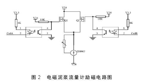 圖中的勵(lì)磁電路工作內(nèi)容是控制儀表的工作磁場。其作用原理為 :單片機(jī) MSP430F2418 定時(shí)器產(chǎn)生了雙頻矩形波,并經(jīng)光耦隔離后與兩片場效應(yīng)管組成了開關(guān)電路,從而實(shí)現(xiàn)了泥漿流量計(jì)使用的通斷功能。另一個(gè)電路 DH902 是恒流管,其為設(shè)備使用提供恒定的勵(lì)磁電流。具體來說,當(dāng) MCU 定時(shí)器的脈沖寬度調(diào)制(PWM)輸出后,經(jīng)過濾波就能有效控制勵(lì)磁電流的幅值,進(jìn)而產(chǎn)出雙頻矩形波。如圖 2 所示,為電磁泥漿流量計(jì)勵(lì)磁電路圖。