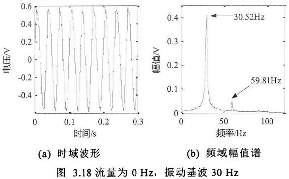 當(dāng)沒(méi)有流動(dòng)時(shí),如圖3.17所示的振動(dòng)臺(tái)會(huì)提供30Hz的水平周期性振動(dòng)干擾,振動(dòng)幅度為0.6mm。 使用示波器收集渦街流量計(jì)傳感器的輸出信號(hào)。 此時(shí),輸出信號(hào)的時(shí)域波形和頻域幅度譜的局部放大圖如圖3.18所示。 采樣頻率為2500Hz,采樣時(shí)間為10s,F(xiàn)FT點(diǎn)為2048。根據(jù)圖3.18(b),基波的真實(shí)頻率為30Hz,峰值頻率為30.52Hz。 二次諧波的真實(shí)頻率為60Hz,峰值頻率為59.81Hz。