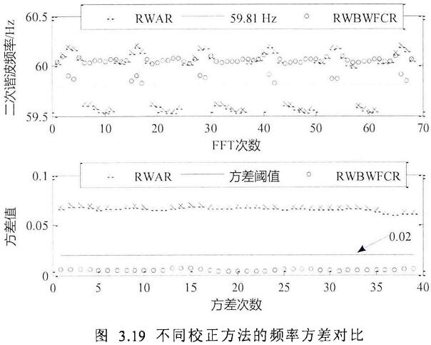 基于10S采樣數(shù)據(jù),計(jì)算了69個(gè)FFT。 RWAR方法和RWBWFCR方法用于估計(jì)二次諧波峰值的頻率。 分別計(jì)算30個(gè)相鄰頻率估算值中每個(gè)估算值的方差。 圖3.19顯示了使用不同方法進(jìn)行校正時(shí)獲得的頻率方差的比較。 從圖3.19中可以看出:(1)由于RWAR校正方法的抗噪能量差,因此錯(cuò)誤地確定了校正方向。 頻率估計(jì)的誤差增加了,諧波干擾的方差超過(guò)了最終的頻率方差法,諧波干擾被誤認(rèn)為是流動(dòng)頻率,從而影響了渦街流量計(jì)的測(cè)量精度。 (2)RWBWFCR校正方法具有很強(qiáng)的抗噪能力,真實(shí)地反映了干擾信號(hào)波動(dòng)小的規(guī)律,保證了頻率方差法的可靠性。
