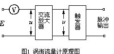 渦街流量計的電阻流體利用壓電晶體檢測渦旋頻率,并通過交流電放大并觸發(fā)壓電信號,將渦旋頻率轉(zhuǎn)換為脈沖信號。發(fā)送到輔助儀器的脈沖信號將轉(zhuǎn)換為顯示測得的流速。其中,交流放大器的放大倍數(shù)K和觸發(fā)器的閾值電壓可以調(diào)節(jié),如圖1所示。